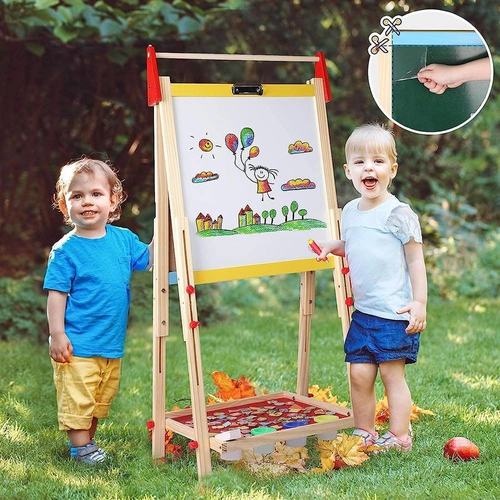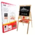 سبورة خشبية للأطفال بواجهتين (سبورة بيضاء وسبورة طباشير) مع ستاند قابل لتعديل الارتفاع، مثالية للرسم والكتابة وتنمية الإبداع، مزودة بملحقات تعليمية مغناطيسية وآمنة للأطفال.