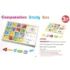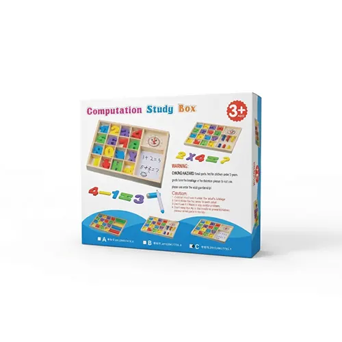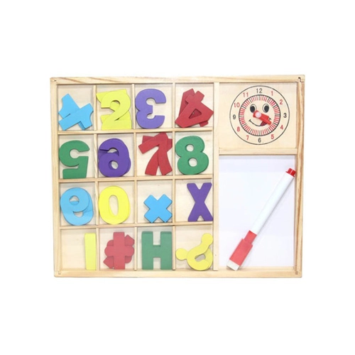 يحتوي الصندوق على لوحة أرقام خشبية، رموز حسابية، وساعة بوجه مبتسم بعقارب متحركة، مما يسهّل على الطفل تعلّم العد، العمليات الحسابية البسيطة، والتعرّف على الوقت بشكل عملي وممتع. كما يتضمن أقلامًا وأدوات تساعد الطفل على التدريب على الكتابة وتنمية المهارات الحركية الدقيقة.