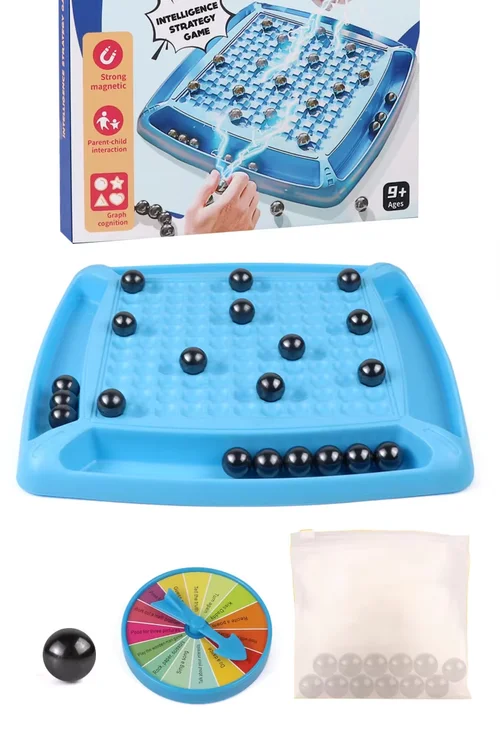 محتويات العبوة: 32 كرة مغناطيسية، لوحة شطرنج، حقيبة تخزين، قرص دوار، ودليل تعليمات.
